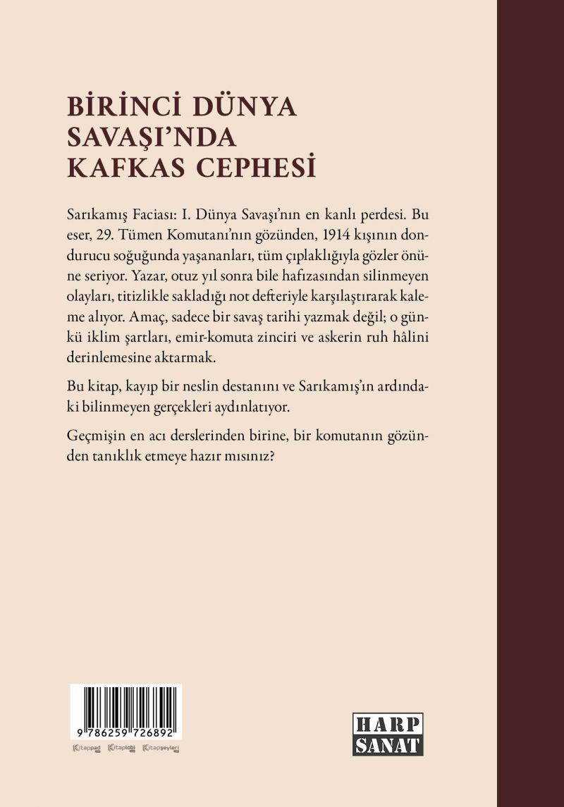 Sarıkamış Faciası: I. Dünya Savaşı'nın en kanlı perdesi. Bu eser, 29. Tümen Komutanı'nın gözünden, 1914 kışının dondurucu soğuğunda yaşananları, tüm çıplaklığıyla gözler önüne seriyor. Yazar, 30 yıl sonra bile hafızasından silinmeyen olayları, titizlikle sakladığı not defteriyle karşılaştırarak kaleme alıyor. Amaç, sadece bir savaş tarihi yazmak değil; o günkü iklim şartları, emir-komuta zinciri ve askerin ruh halini derinlemesine aktarmak.