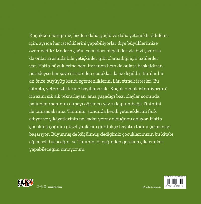 Küçükken hangimiz, bizden daha güçlü ve daha yetenekli oldukları için, ayrıca her istediklerini yapabiliyorlar diye büyüklerimize özenmedik? Modern çağın çocukları bilgelikleriyle bizi şaşırtsa da onlar arasında bile yetişkinler gibi olamadığı için üzülenler var. Hatta büyüklerine hem imrenen hem de onlara başkaldıran, neredeyse her şeye itiraz eden çocuklar da az değildir. Bunlar bir an önce büyüyüp kendi egemenliklerini ilân etmek isterler. Bu kitapta, yetersizliklerine hayıflanarak “Küçük olmak istemiyorum” itirazını sık sık tekrarlayan, ama yaşadığı bazı olaylar sonunda, halinden memnun olmayı öğrenen yavru kaplumbağa Tinimini ile tanışacaksınız. Tinimini, sonunda kendi yeteneklerini fark ediyor ve şikâyetlerinin ne kadar yersiz olduğunu anlıyor. Hatta çocukluk çağının güzel yanlarını gördükçe hayatın tadını çıkarmayı başarıyor. Büyümüş de küçülmüş dediğimiz çocuklarımızın bu kitabı eğlenceli bulacağını ve Tinimini örneğinden gereken çıkarımları yapabileceğini umuyorum.