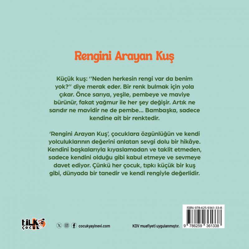 ‘Rengini Arayan Kuş’, çocuklara özgünlüğün ve kendi yolculuklarının değerini anlatan sevgi dolu bir hikâye. Kendini başkalarıyla kıyaslamadan ve taklit etmeden, sadece kendini olduğu gibi kabul etmeye ve sevmeye davet ediyor. Çünkü her çocuk, tıpkı küçük bir kuş gibi, dünyada bir tanedir ve kendi rengiyle değerlidir.