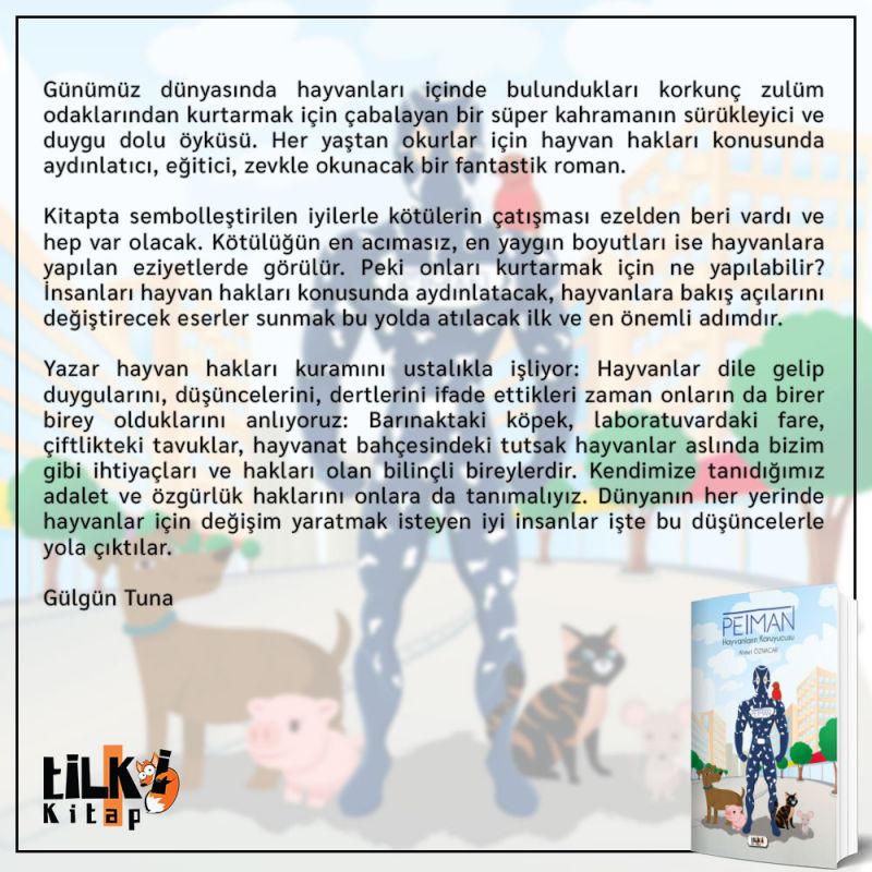Günümüz dünyasında hayvanları içinde bulundukları korkunç zulüm odaklarından kurtarmak için çabalayan bir süper kahramanın sürükleyici ve duygu dolu öyküsü. Her yaştan okurlar için hayvan hakları konusunda aydınlatıcı, eğitici, zevkle okunacak bir fantastik roman.