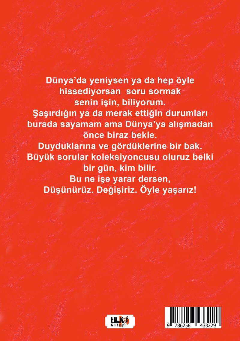 Dünya'da yeniysen ya da hep öyle hissediyorsan soru sormak senin işin, biliyorum. Şaşırdığın ya da merak ettiğin durumları burada sayamam ama Dünya'ya alışmadan önce biraz bekle. Duyduklarına ve gördüklerine bir bak. Büyük sorular koleksiyoncusu oluruz belki bir gün, kim bilir. Bu ne işe yarar dersen, Düşünürüz. Değişiriz. Öyle yaşarız!