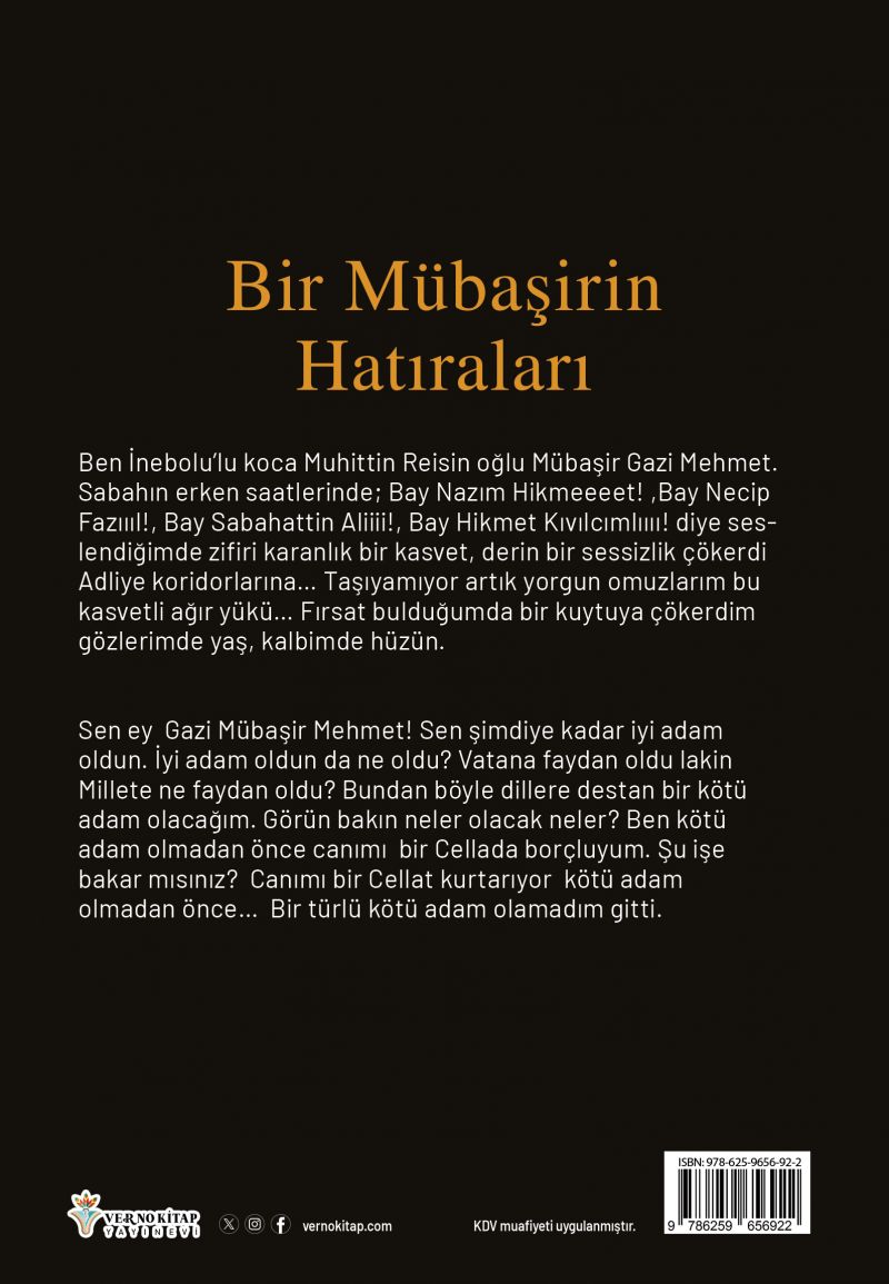 Ben İnebolu’lu koca Muhittin Reisin oğlu Mübaşir Gazi Mehmet. Sabahın erken saatlerinde; Bay Nazım Hikmeeeet! ,Bay Necip Fazıııl!, Bay Sabahattin Aliiii!, Bay Hikmet Kıvılcımlıııı! diye seslendiğimde zifiri karanlık bir kasvet, derin bir sessizlik çökerdi Adliye koridorlarına… Taşıyamıyor artık yorgun omuzlarım bu kasvetli ağır yükü… Fırsat bulduğumda bir kuytuya çökerdim gözlerimde yaş, kalbimde hüzün.