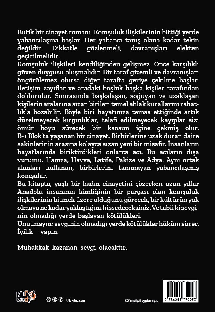Bu kitapta, yaşlı bir kadın cinayetini çözerken uzun yıllar Anadolu insanının kimliğinin bir parçası olan komşuluk ilişkilerinin bitmek üzere olduğunu görecek, bir kültürün yok olmaya ne kadar yaklaştığını hissedeceksiniz. Ve tabii ki sevginin olmadığı yerde başlayan kötülükleri.