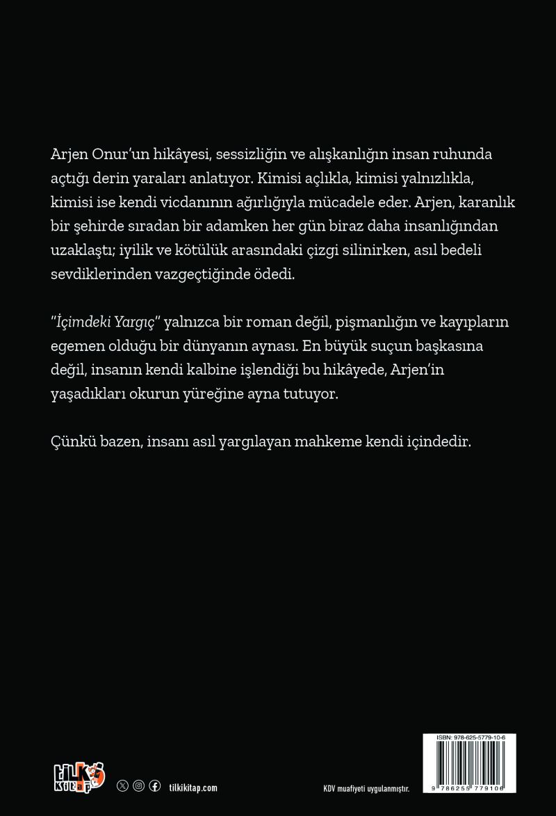 “İçimdeki Yargıç” yalnızca bir roman değil, pişmanlığın ve kayıpların egemen olduğu bir dünyanın aynası. En büyük suçun başkasına değil, insanın kendi kalbine işlendiği bu hikâyede, Arjen’in yaşadıkları okurun yüreğine ayna tutuyor.