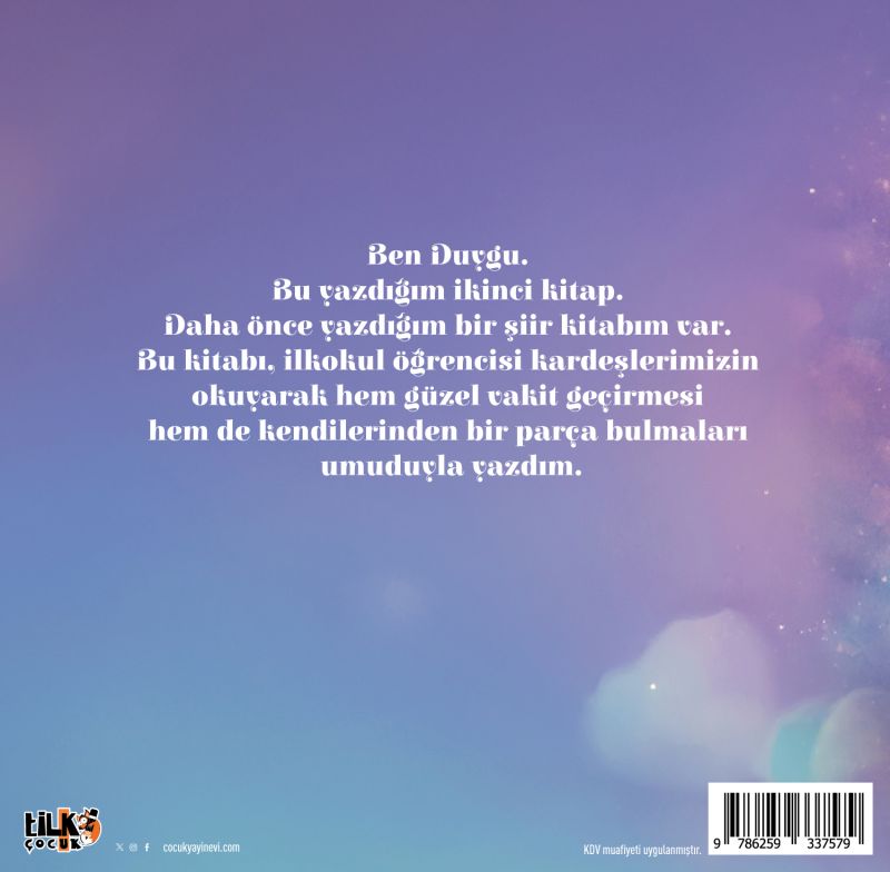 Bu kitabı yazma amacım; ilkokul öğrencisi kardeşlerimizin okuyarak hem güzel vakit geçirmesi hem de kendilerinden bir parça bulmalarını umut etmektir.