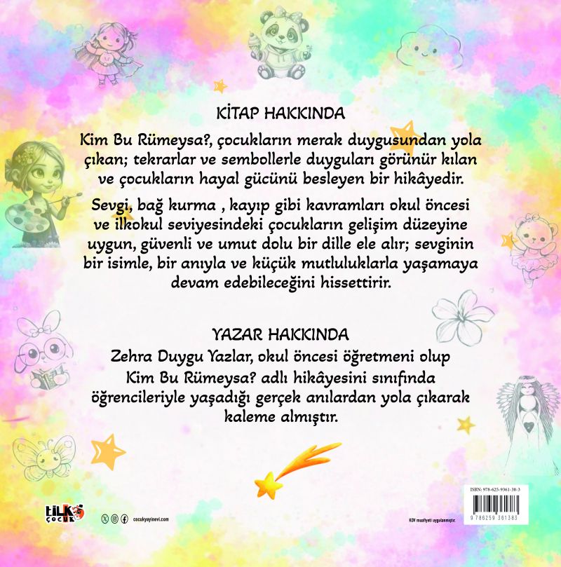 Kim Bu Rümeysa? Çocukların merak duygusundan yola çıkan; tekrarlar ve sembollerle duyguları görünür kılan ve çocukların hayal gücünü besleyen bir hikâyedir. Sevgi, bağ kurma, kayıp gibi kavramları okul öncesi ve ilkokul seviyesindeki çocukların gelişim düzeyine uygun, güvenli ve umut dolu bir dille ele alır; sevginin bir isimle, bir anıyla ve küçük mutluluklarla yaşamaya devam edebileceğini hissettirir.