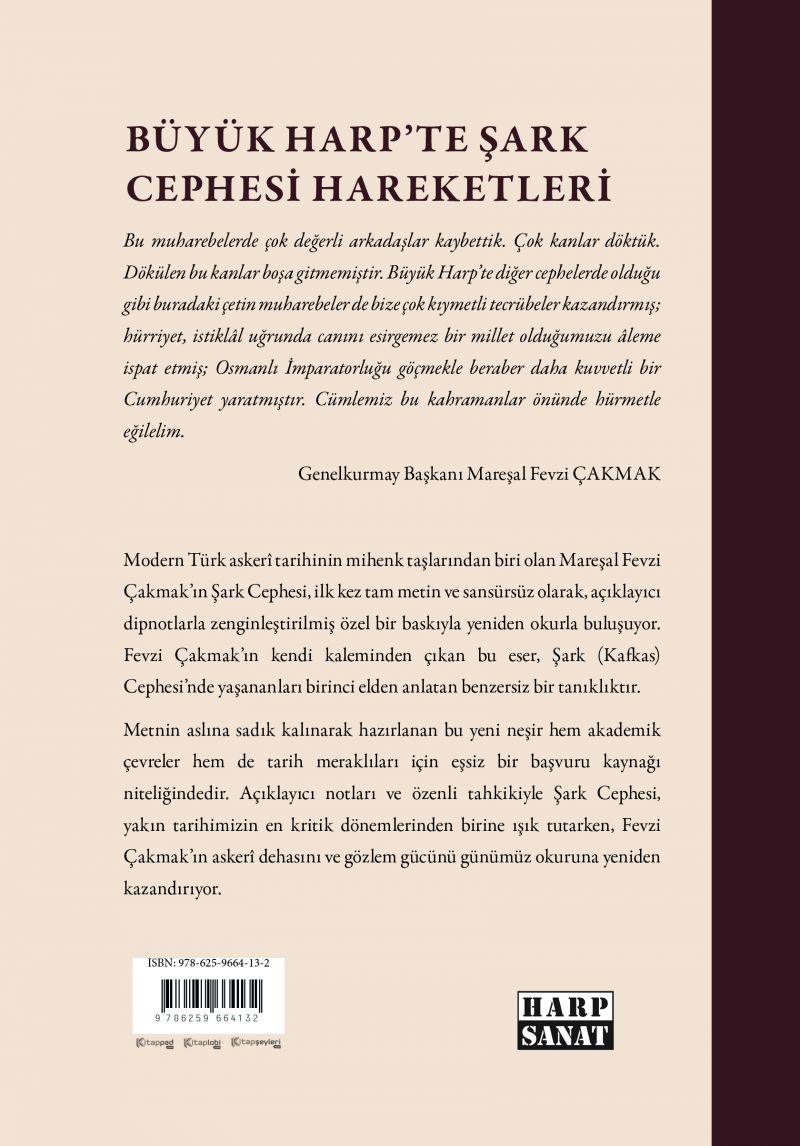 Metnin aslına sadık kalınarak hazırlanan bu yeni neşir hem akademik çevreler hem de tarih meraklıları için eşsiz bir başvuru kaynağı niteliğindedir. Açıklayıcı notları ve özenli tahkikiyle Şark Cephesi, yakın tarihimizin en kritik dönemlerinden birine ışık tutarken, Fevzi Çakmak’ın askerî dehasını ve gözlem gücünü günümüz okuruna yeniden kazandırıyor.