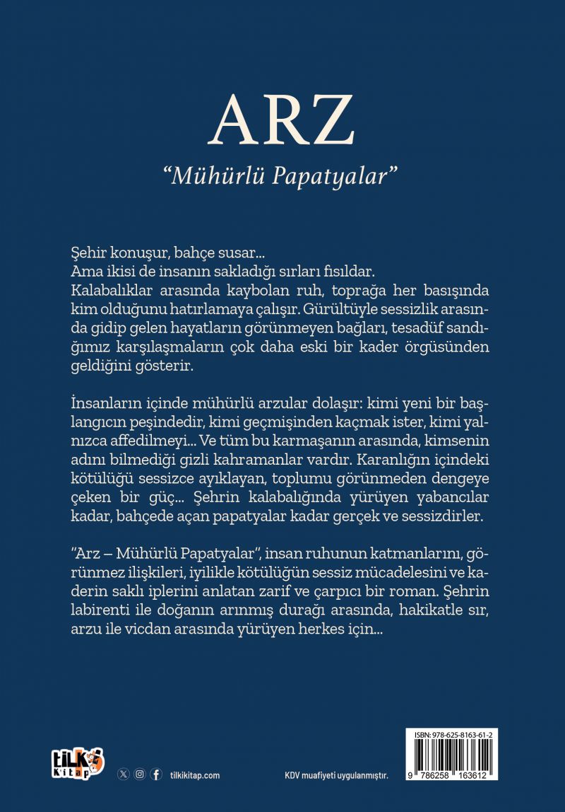 “Arz – Mühürlü Papatyalar”, insan ruhunun katmanlarını, görünmez ilişkileri, iyilikle kötülüğün sessiz mücadelesini ve kaderin saklı iplerini anlatan zarif ve çarpıcı bir roman. Şehrin labirenti ile doğanın arınmış durağı arasında, hakikatle sır, arzu ile vicdan arasında yürüyen herkes için…