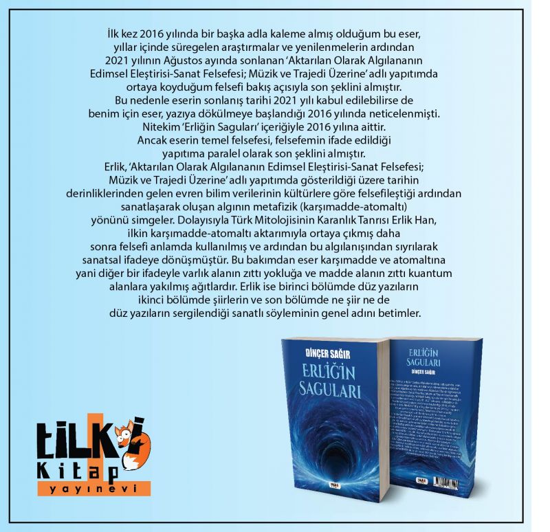 İlk kez 2016 yılında bir başka adla kaleme almış olduğum bu eser, yıllar içinde süregelen araştırmalar ve yenilenmelerin ardından 2021 yılının Ağustos ayında sonlanan Aktarılan Olarak Algılananın Edimsel Eleştirisi-Sanat Felsefesi; Müzik ve Trajedi Üzerine adlı yapıtımda ortaya koyduğum felsefi bakış açısıyla son şeklini almıştır. Bu nedenle eserin sonlanış tarihi 2021 yılı kabul edilebilirse de benim için eser, yazıya dökülmeye başlandığı 2016 yılında neticelenmişti. Nitekim 'Erliğin Saguları' içeriğiyle 2016 yılına aittir. Ancak eserin temel felsefesi, felsefemin ifade edildiği yapıtıma paralel olarak son şeklini almıştır.