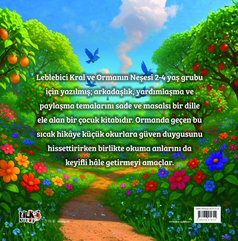 Leblebici Kral ve Ormanın Neşesi 2-4 yaş grubu için yazılmış; arkadaşlık, yardımlaşma ve paylaşma temalarını sade ve masalsı bir dille ele alan bir çocuk kitabıdır. Ormanda geçen bu sıcak hikâye küçük okurlara güven duygusunu hissettirirken birlikte okuma anlarını da keyifli hâle getirmeyi amaçlar.