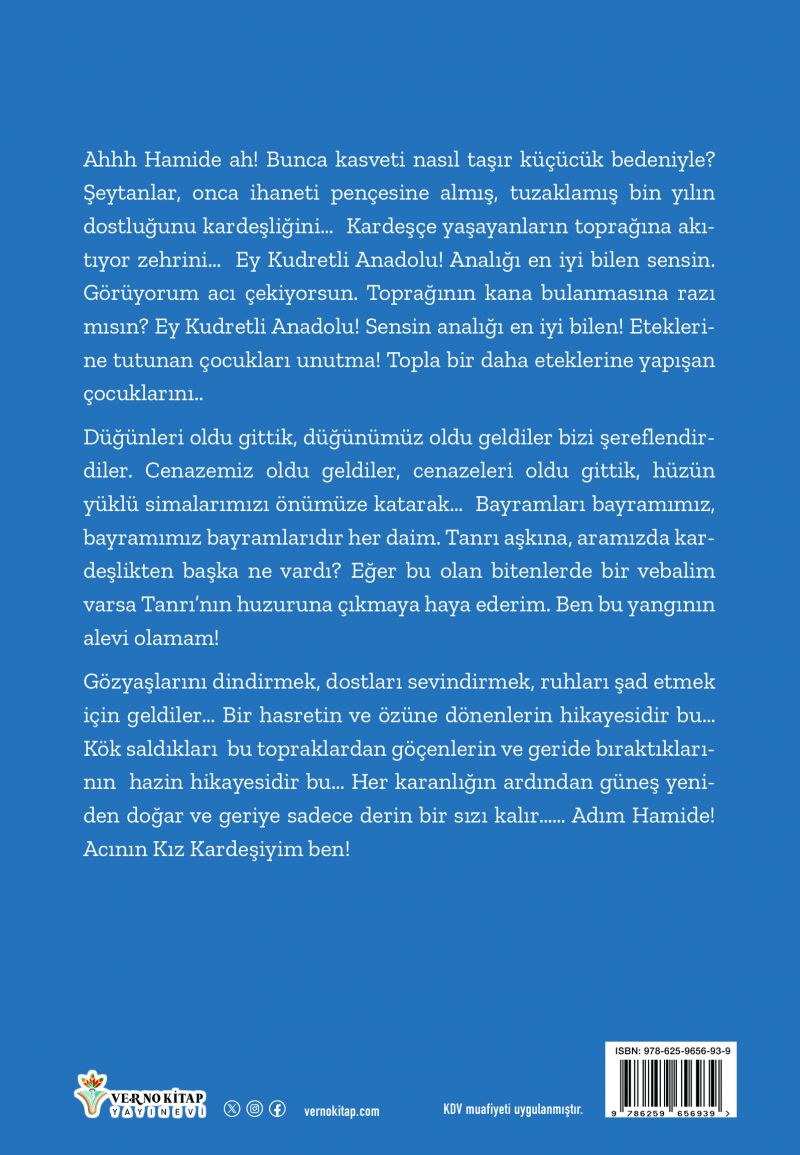 Gözyaşlarını dindirmek, dostları sevindirmek, ruhları şad etmek için geldiler… Bir hasretin ve özüne dönenlerin hikayesidir bu… Kök saldıkları bu topraklardan göçenlerin ve geride bıraktıklarının hazin hikayesidir bu… Her karanlığın ardından güneş yeniden doğar ve geriye sadece derin bir sızı kalır…… Adım Hamide! Acının Kız Kardeşiyim ben!