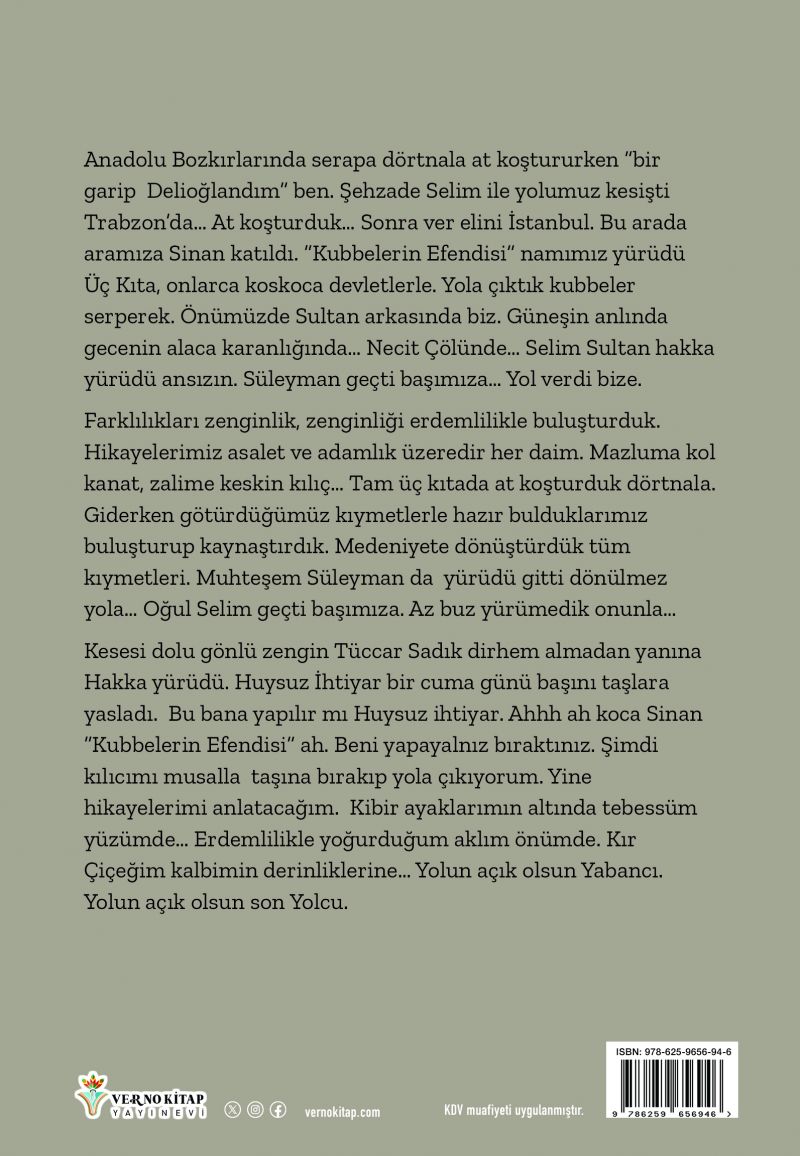 Anadolu Bozkırlarında dörtnala at koştururken “Bir garip Delioğlandım“ ben. Şehzade Selim ile yolumuz kesişti Trabzon’da… At koşturduk… Sonra ver elini İstanbul. Bu arada Sinan ve Sadık’ta katıldı aramıza. “Kubbelerin Efendisi” Sinan. Namımız yürüdü Üç Kıtada. Yola çıktık kubbeler serperek. Önümüzde Sultan arkasında biz. Güneşin alnında gecenin alaca karanlığında… Sina Çölünde…Selim Sultan hakka yürüdü ansızın. Süleyman geçti başımıza… Yol verdi bize. Farklılıkları zenginlik, zenginliği erdemlilikle buluşturduk. Medeniyete dönüştürdük tüm kıymetleri. Muhteşem Süleyman da yürüdü gitti dönülmez yola… Oğul Selim geçti başımıza. O da çok erken çıktı Mahşeri yolculuğa. Ardından kesesi dolu, gönlü zengin cömert Sadık, yanına dirhem bile almadan yürüdü o yola doğru, sonrasında da Sinan. Bir ben kaldım yapayalnız tek başıma.