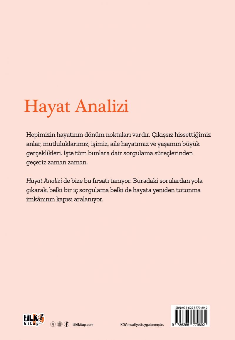 Hayat Analizi de bize bu fırsatı tanıyor. Buradaki sorulardan yola çıkarak, belki bir iç sorgulama belki de hayata yeniden tutunma imkânının kapısı aralanıyor.