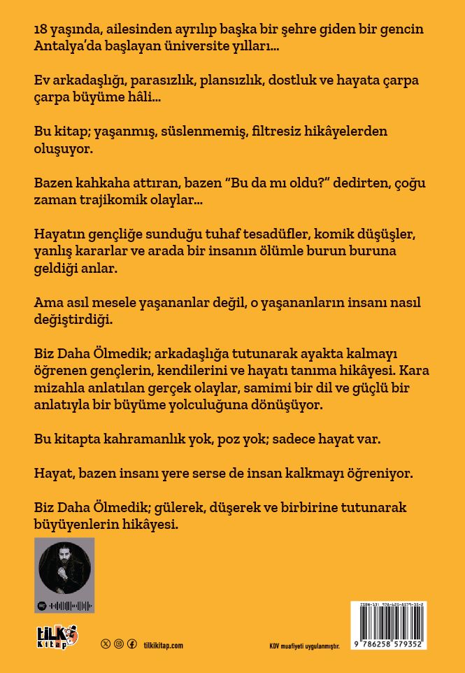 Biz Daha Ölmedik; arkadaşlığa tutunarak ayakta kalmayı öğrenen gençlerin, kendilerini ve hayatı tanıma hikâyesi. Kara mizahla anlatılan gerçek olaylar, samimi bir dil ve güçlü bir anlatıyla bir büyüme yolculuğuna dönüşüyor.