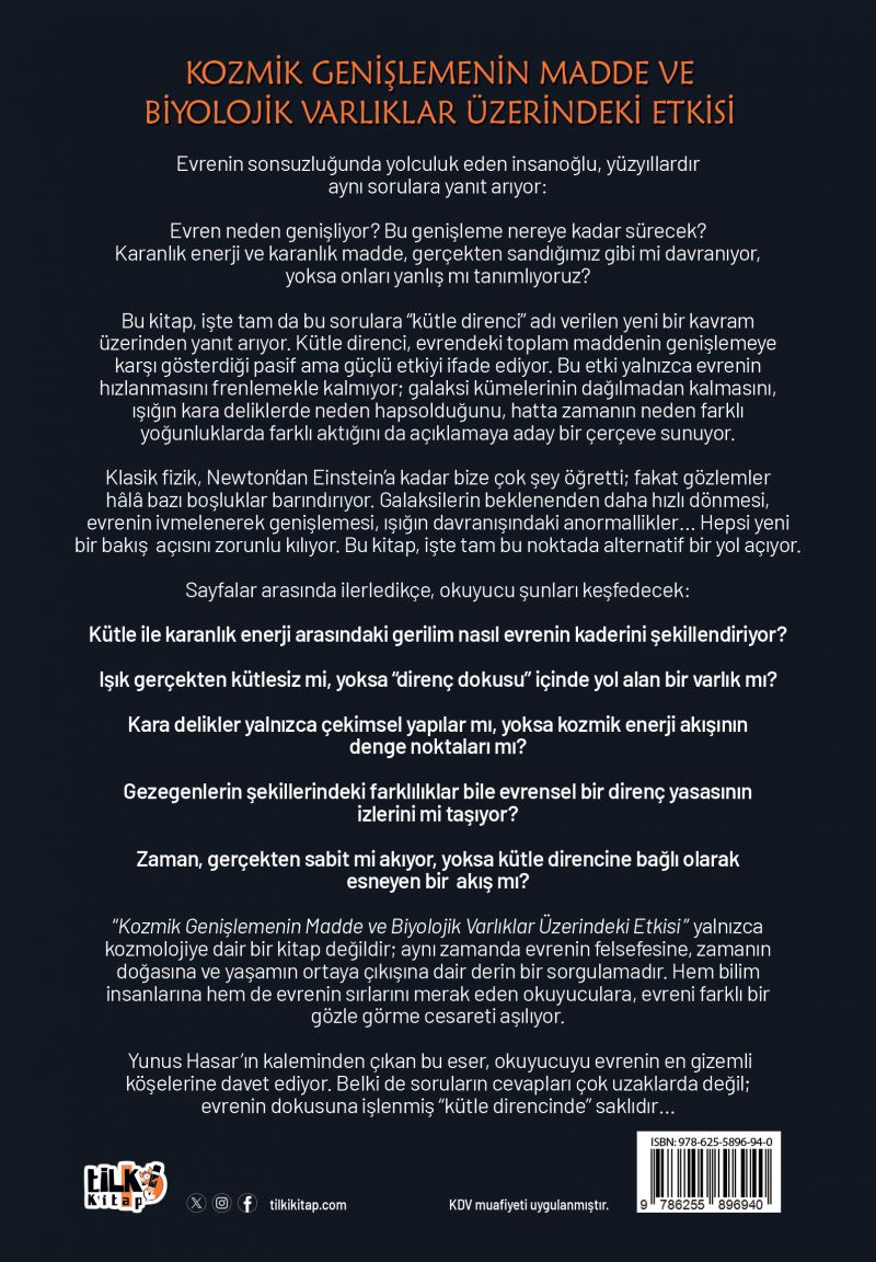 Bu kitap, işte tam da bu sorulara “kütle direnci” adı verilen yeni bir kavram üzerinden yanıt arıyor. Kütle direnci, evrendeki toplam maddenin genişlemeye karşı gösterdiği pasif ama güçlü etkiyi ifade ediyor. Bu etki yalnızca evrenin hızlanmasını frenlemekle kalmıyor; galaksi kümelerinin dağılmadan kalmasını, ışığın kara deliklerde neden hapsolduğunu, hatta zamanın neden farklı yoğunluklarda farklı aktığını da açıklamaya aday bir çerçeve sunuyor.